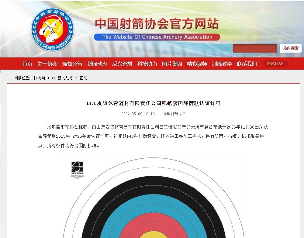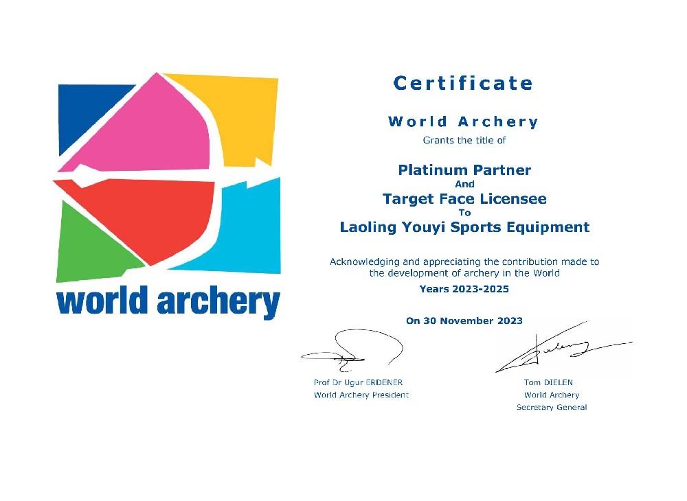目前,主要生產(chǎn)和銷售射箭比賽及訓(xùn)練專用器材,包括:箭靶、靶紙、靶架、號碼牌、風(fēng)向旗、計時記分器等場地器材設(shè)備;反曲弓、復(fù)合弓、傳統(tǒng)弓、瞄準(zhǔn)器、防震桿等弓箭裝備;箭壺、護胸、護臂、護指等各類箱包護具。公司所生產(chǎn)的射箭器材已通過國際射箭聯(lián)合會及中國射箭協(xié)會CAA認證。